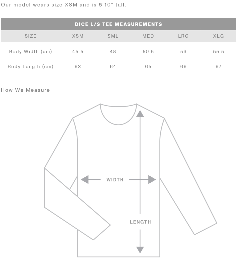 FIT: Regular fit - please check the size chart to avoid disappointment. Lay your own tee flat on a table, measure armpit to armpit across the chest and match to the size you feel is best. Please note measurements can vary within 2.5cm, this is within the accepted tolerance.