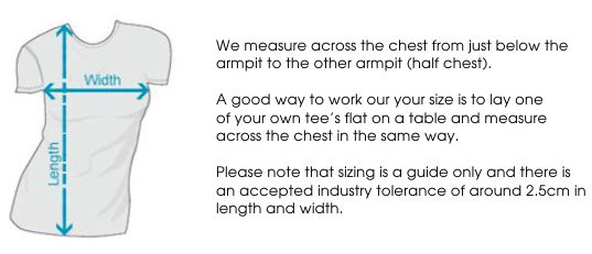 FIT: Semi-fit - please check the size chart to avoid disappointment. Lay your own tee flat on a table, measure armpit to armpit across the chest and match to the size you feel is best. Please note measurements can vary within 2.5cm, this is within the accepted tolerance.