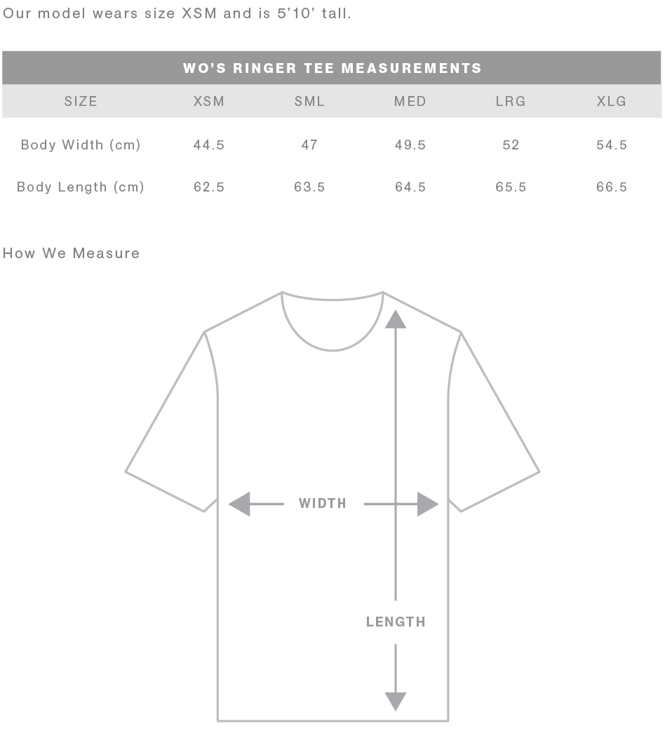 FIT: Regular fit - please check the size chart to avoid disappointment. Lay your own tee flat on a table, measure armpit to armpit across the chest and match to the size you feel is best. Please note measurements can vary within 2.5cm, this is within the accepted tolerance.