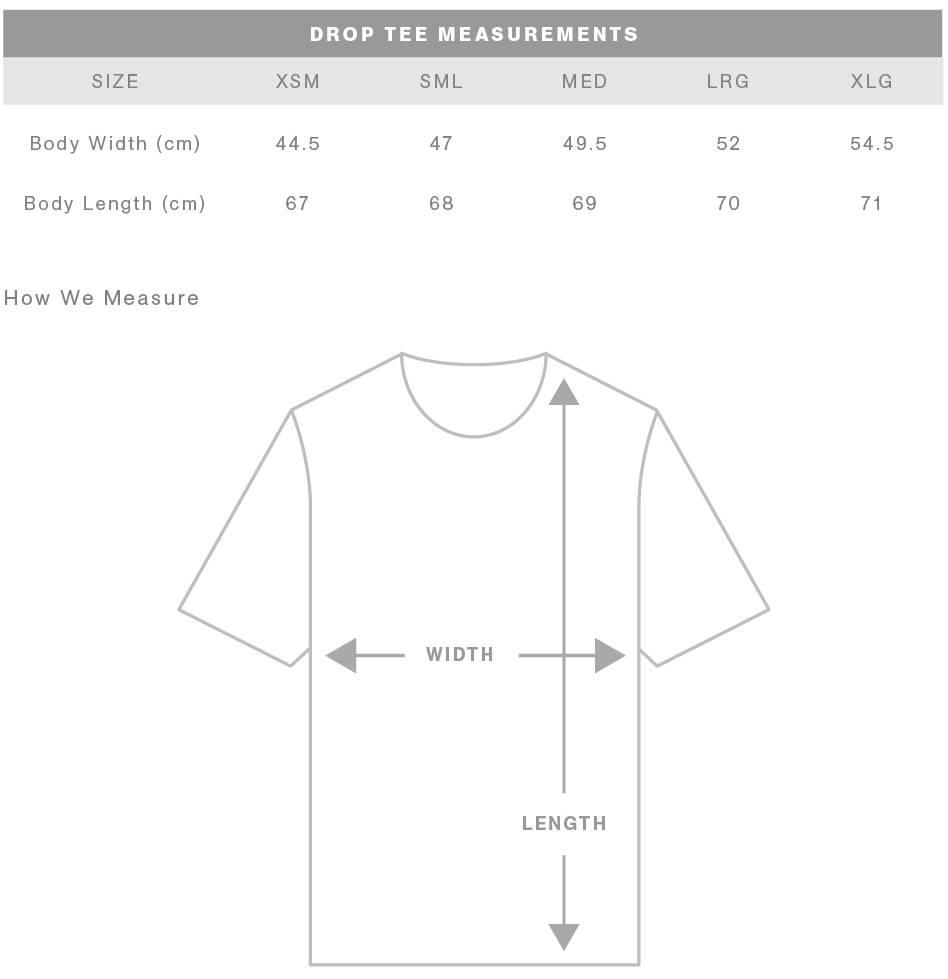 FIT: Regular fit - please check the size chart to avoid disappointment. Lay your own tee flat on a table, measure armpit to armpit across the chest and match to the size you feel is best. Please note measurements can vary within 2.5cm, this is within the accepted tolerance.